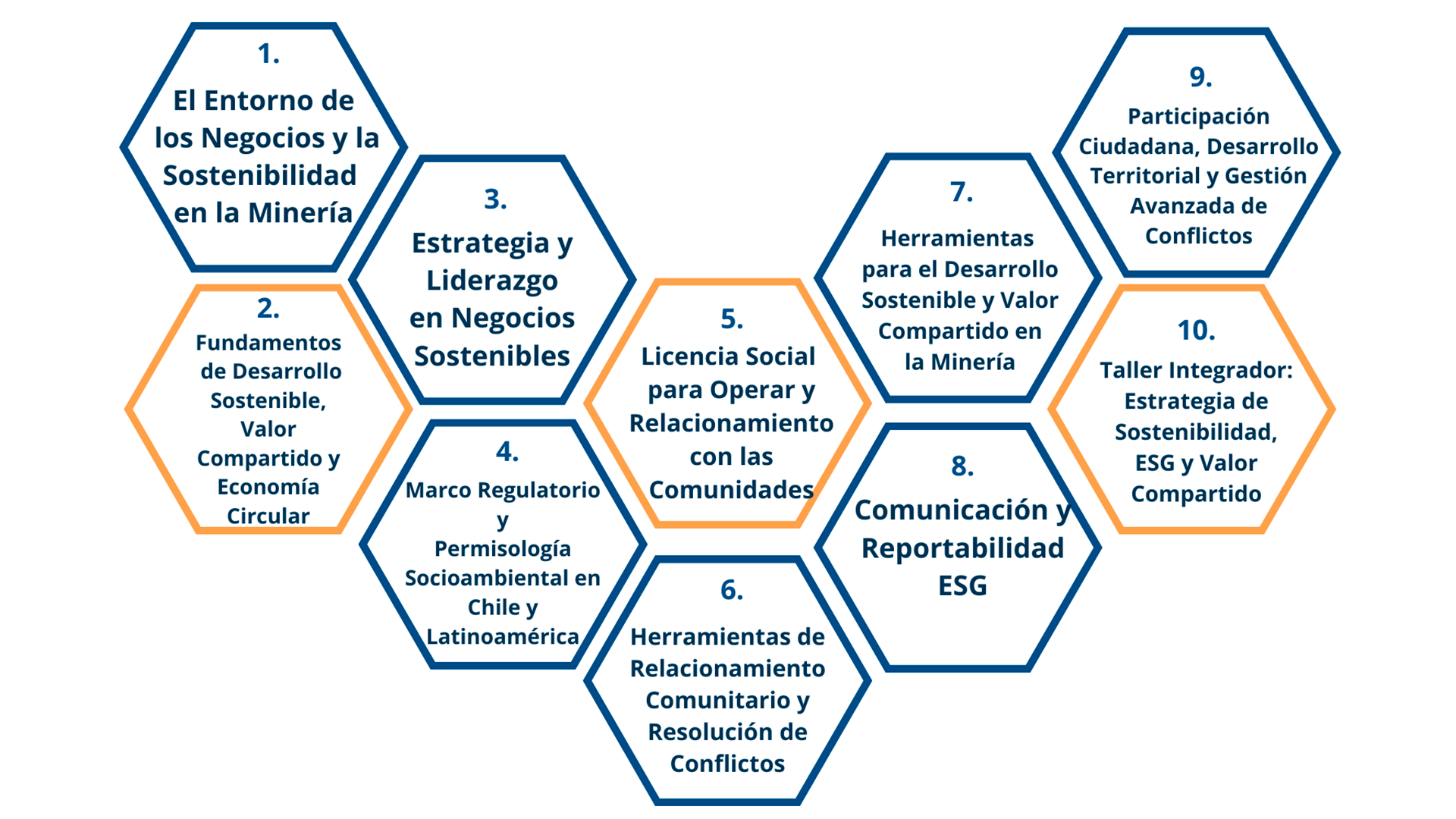 «El Diplomado en Desarrollo Sostenible y Gestión de Comunidades, adscrito a la Escuela de Negocios Mineros, forma profesionales capaces de liderar estrategias de sostenibilidad y relacionamiento comunitario en la industria minera. El programa entrega herramientas para abordar desafíos socioambientales, integrar estándares ESG, fortalecer la licencia social para operar y diseñar soluciones colaborativas que promuevan el valor compartido, la participación y la gobernanza territorial en contextos complejos».